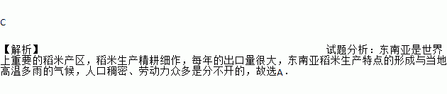 C ¡¾½âÎö¡¿ÊÔÌâ·ÖÎö£º¶«ÄÏÑÇÊÇÊÀ½çÉÏÖØÒªµÄµ¾ÃײúÇø£¬µ¾Ã×Éú²ú¾«¸ûϸ×÷£¬Ã¿ÄêµÄ³ö¿ÚÁ¿ºÜ´ó£¬¶«ÄÏÑǵ¾Ã×Éú²úÌØµãµÄÐγÉÓëµ±µØ¸ßζàÓêµÄÆøºò£¬È˿ڳíÃÜ¡¢ÀͶ¯Á¦ÖÚ¶àÊÇ·Ö²»¿ªµÄ£¬¹ÊÑ¡A£®
