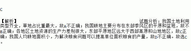 C 【解析】试题分析:我国土地利用类型齐全,草地占比重最大,故A不正确;我国耕地主要分布在东部季风区的平原和盆地,故不B正确;各地区土地资源的生产力差别很大,东部平原地区远大于西部高原和山地地区,故C正确;我国人均耕地面积小,为解决粮食问题可以提高单位面积粮食的产量,故D不正确。故选C。