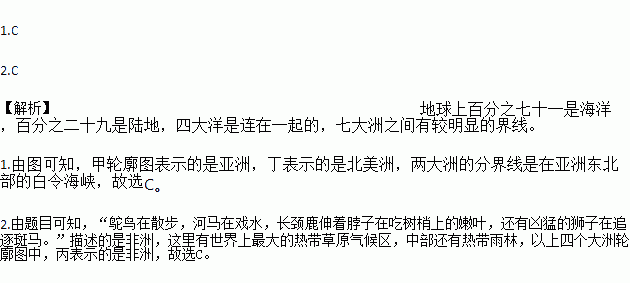 2.“鸵鸟在散步,河马在戏水,长颈鹿伸着脖子在吃树梢上的嫩叶,还有凶猛的狮子在追逐斑马。”可以看到上述景象的大洲是