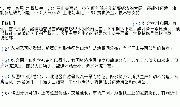 1)黄土高原 沟壑纵横 (2)三山夹两盆 (3)既能够带动新疆经济的发展,还能够环境上海能源短缺的问题 (4)大气污染 土地荒漠化 (5)提供资金、技术等支持 【解析】(1)结合材料和图示可知,西气东输一线输油管道西起新疆塔里木的轮南油田,向东到达上海,经过黄土高原地区,地形特征支离破碎(千沟万壑)。这里主要的生态问题是水土流失严重,生物措施是植树种草,土埂还林。 (2)从图乙可以看出...