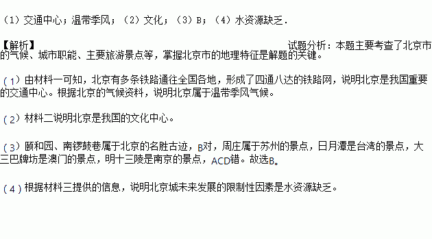(1)材料一中,北京有多条铁路通往全国各地,形成了四通八达的铁路网,说明北京是我国重要的 .根据北京的气候资料,说明北京属于 气候.