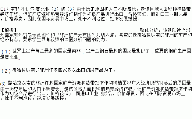 £¨1£©ÄÏ·Ç ÔúÒÁ¶û ÔÞ±ÈÑÇ£¨2£©³õ£¨3£©ÓÉÓÚÀúÊ·ÔÒòºÍÈ˿ڲ»¶ÏÔö³¤£¬ÊǸÃÇøÓò´óÃæ»ýÖÖÖ²ÈÈ´ø¾¼Ã×÷Îµ«¿ó²ú×ÊÔ´ºÍÈÈ´ø¾¼Ã×÷Îï×÷Ϊ³õ¼¶²úÆ·½øÐгö¿Ú£¬¼Û¸ñ½ÏµÍ£»¶ø½ø¿Ú¹¤ÒµÖÆ³ÉÆ·£¬¼Û¸ñ°º¹ó£¬Òò´ËÔÚ¹ú¼ÊóÒ×Êг¡ÉÏ£¬´¦ÓÚ²»ÀûµØÎ»¡£¾¼Ã·¢Õ¹»ºÂý¡£ ¡¾½âÎö¡¿ÕûÌå·ÖÎö£º¸ÃÌâÒÔ¶Á¡°²¿·Ö¹ú¼Ò¶ÔÍâóÒ×ʾÒâͼ¡±ºÍ¡°·ÇÖÞ¿ó²ú·Ö²¼Í¼¡±ÎªÇÐÈëµã£¬¿¼²éµÄÊÇÈö¹þÀÒÔÄϵķÇÖ޵Ŀó²úºÍ¾¼ÃÌØµã£¬ÒªÇóѧÉú¾ßÓнÏÇ¿µÄ¶Áͼ·ÖÎöÎÊÌâµÄÄÜ...