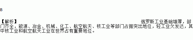 B 【解析】俄罗斯工业基础雄厚,部门齐全,能源、冶金、机械、化工、航空航天、核工业等部门占据突出地位,轻工业欠发达,其中核工业和航空航天工业在世界占有重要地位。