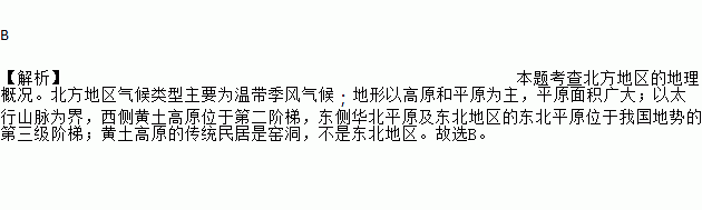 B ¡¾½âÎö¡¿ ±¾Ì⿼²é±±·½µØÇøµÄµØÀí¸Å¿ö¡£±±·½µØÇøÆøºòÀàÐÍÖ÷ҪΪδø¼¾·çÆøºò£»µØÐÎÒÔ¸ßÔºÍÆ½ÔΪÖ÷£¬Æ½ÔÃæ»ý¹ã´ó£»ÒÔÌ«ÐÐɽÂöΪ½ç£¬Î÷²à»ÆÍÁ¸ßÔλÓÚµÚ¶þ½×ÌÝ£¬¶«²à»ª±±Æ½Ô¼°¶«±±µØÇøµÄ¶«±±Æ½ÔλÓÚÎÒ¹úµØÊƵĵÚÈý¼¶½×ÌÝ£»»ÆÍÁ¸ßԵĴ«Í³Ãñ¾ÓÊÇÒ¤¶´£¬²»ÊǶ«±±µØÇø¡£¹ÊÑ¡B¡£