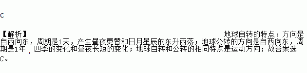 C 【解析】地球自转的特点:方向是自西向东,周期是1天,产生昼夜更替和日月星辰的东升西落;地球公转的方向是自西向东,周期是1年,四季的变化和昼夜长短的变化;地球自转和公转的相同特点是运动方向;故答案选C。
