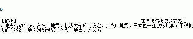 D 【解析】在板块与板块的交界处,地壳活动活跃,多火山地震,板块内部较为稳定,少火山地震,日本位于亚欧板块和太平洋板块的交界处,地壳活动活跃,多火山地震,故选D。
