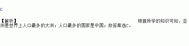 C 【解析】根据所学的知识可知,亚洲是世界上人口最多的大洲;人口最多的国家是中国;故答案选C。