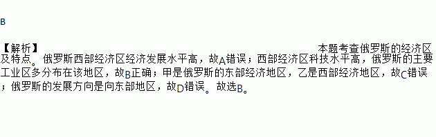 B 【解析】本题考查俄罗斯的经济区及特点。俄罗斯西部经济区经济发展水平高,故A错误;西部经济区科技水平高,俄罗斯的主要工业区多分布在该地区,故B正确;甲是俄罗斯的东部经济地区,乙是西部经济地区,故C错误;俄罗斯的发展方向是向东部地区,故D错误。故选B。