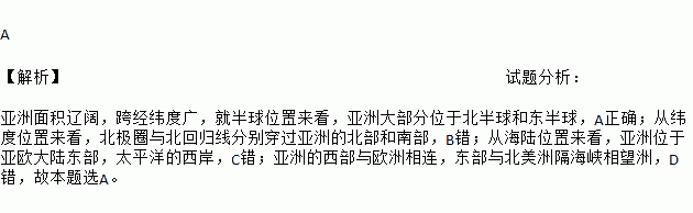 A 【解析】试题分析: 亚洲面积辽阔,跨经纬度广,就半球位置来看,亚洲大部分位于北半球和东半球,A正确;从纬度位置来看,北极圈与北回归线分别穿过亚洲的北部和南部,B错;从海陆位置来看,亚洲位于亚欧大陆东部,太平洋的西岸,C错;亚洲的西部与欧洲相连,东部与北美洲隔海峡相望洲,D错,故本题选A。