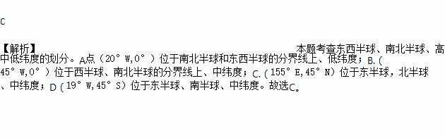 A. 20°W,0° B. 45°W,0° C. 155°E,45°N D. 19°W,45°S