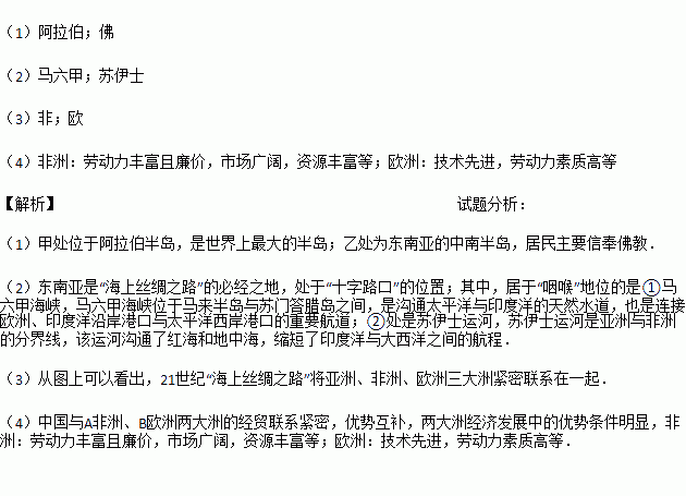 (2)“海上丝绸之路”上的交通要道有①处的 海峡和②处的_________运河。