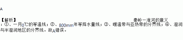 A 【解析】秦岭—淮河的意义:①、一月0℃的等温线;②、800mm年等降水量线;③、暧温带与亚热带的分界线;④、湿润与半湿润地区的分界线。故A错误。