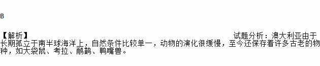 B 【解析】试题分析:澳大利亚由于长期孤立于南半球海洋上,自然条件比较单一,动物的演化很缓慢,至今还保存着许多古老的物种,如大袋鼠、考拉、鸸鹋、鸭嘴兽。
