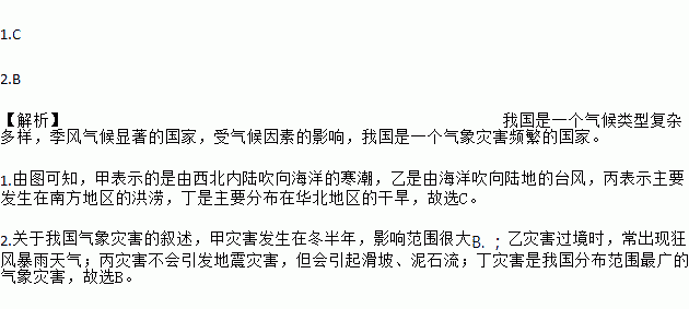 1.C 2.B 【解析】我国是一个气候类型复杂多样,季风气候显著的国家,受气候因素的影响,我国是一个气象灾害频繁的国家。 1.由图可知,甲表示的是由西北内陆吹向海洋的寒潮,乙是由海洋吹向陆地的台风,丙表示主要发生在南方地区的洪涝,丁是主要分布在华北地区的干旱,故选C。 2.关于我国气象灾害的叙述,甲灾害发生在冬半年,影响范围很大B. ;乙灾害过境时,常出现狂风暴雨天气;丙灾...