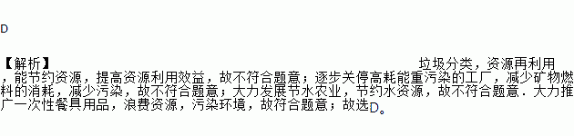 D 【解析】垃圾分类,资源再利用,能节约资源,提高资源利用效益,故不符合题意;逐步关停高耗能重污染的工厂,减少矿物燃料的消耗,减少污染,故不符合题意;大力发展节水农业,节约水资源,故不符合题意.大力推广一次性餐具用品,浪费资源,污染环境,故符合题意;故选D。