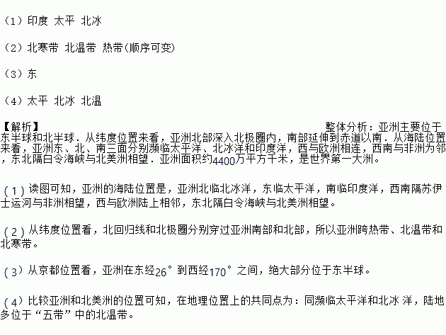 (1)印度 太平 北冰 (2)北寒带 北温带 热带(顺序可变) (3)东 (4)太平 北冰 北温 【解析】整体分析:亚洲主要位于东半球和北半球.从纬度位置来看,亚洲北部深入北极圈内,南部延伸到赤道以南.从海陆位置来看,亚洲东、北、南三面分别濒临太平洋、北冰洋和印度洋,西与欧洲相连,西南与非洲为邻,东北隔白令海峡与北美洲相望.亚洲面积约4400万平方千米,是世界第一大洲。 ...