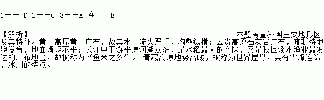 1—— D 2——C 3——A 4――B 【解析】本题考查我国主要地形区及其特征。黄土高原黄土广布,故其水土流失严重,沟壑纵横;云贵高原石灰岩广布,喀斯特地貌发育,地面崎岖不平;长江中下游平原河湖众多,是水稻最大的产区,又是我国淡水渔业最发达的广布地区,故被称为“鱼米之乡”。 青藏高原地势高峻,被称为世界屋脊,具有雪峰连绵,冰川的特点。
