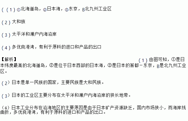 £¨£¨1£©¢Ù±±º£µÀµº£¬¢ÚÈÕ±¾º££¬¢Û¶«¾©£¬B±±¾ÅÖݹ¤ÒµÇø £¨2£©´óºÍ×å £¨3£©Ì«Æ½ÑóºÍäþ»§ÄÚº£Ñذ¶ £¨4£©¶àÓÅÁ¼¸ÛÍ壬ÓÐÀûÓÚÔÁϵĽø¿ÚºÍ²úÆ·µÄ³ö¿Ú ¡¾½âÎö¡¿£¨1£©ÓÉͼ¿ÉÖª£¬¢ÙÊÇÈÕ±¾Î³¶È×î¸ßµÄ±±º£µÀµº£¬¢ÚÊÇλÓÚÈÕ±¾Î÷²¿µÄÈÕ±¾º££¬¢ÛÊÇÈÕ±¾µÄÊ×¶¼£¶«¾©£¬BÊDZ±¾ÅÖݹ¤ÒµÇø¡£ £¨2£©ÈÕ±¾Êǵ¥Ò»Ãñ×åµÄ¹ú¼Ò£¬Ö÷ÒªÃñ×åÊÇ´óºÍÃñ×å¡£ £¨3£©ÈÕ±¾µÄ¹¤ÒµÇøÖ÷Òª·Ö²¼ÔÚ̫ƽÑóºÍäþ»§ÄÚº£Ñذ¶µÄ...