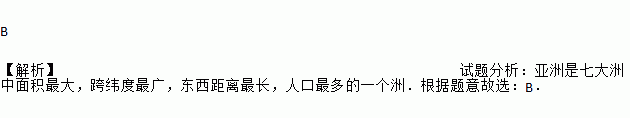 B 【解析】试题分析:亚洲是七大洲中面积最大,跨纬度最广,东西距离最长,人口最多的一个洲.根据题意故选:B.