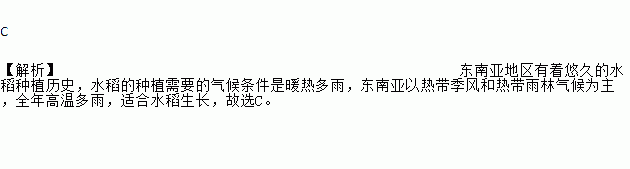 C 【解析】东南亚地区有着悠久的水稻种植历史,水稻的种植需要的气候条件是暖热多雨,东南亚以热带季风和热带雨林气候为主,全年高温多雨,适合水稻生长,故选C。