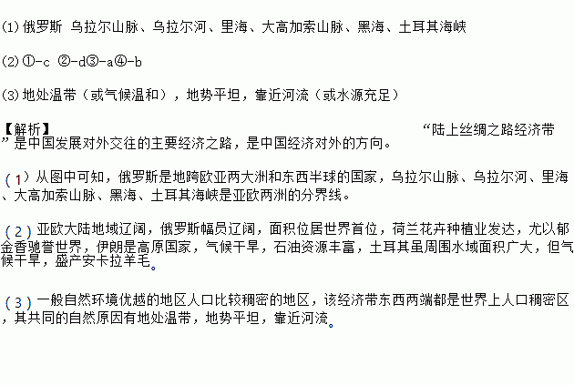 (1)该经济带横穿亚欧大陆,联系了亚欧两个大洲的多个国家。这些国家中,同时地跨亚欧两洲和东、西半球的是____。亚欧两洲的分界线是_______。