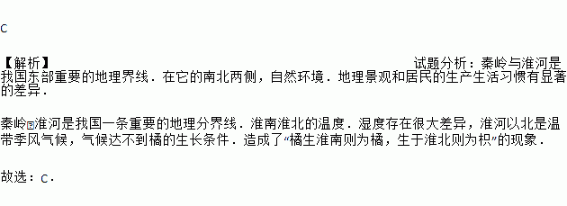 C 【解析】试题分析:秦岭与淮河是我国东部重要的地理界线.在它的南北两侧,自然环境.地理景观和居民的生产生活习惯有显著的差异. 秦岭﹣淮河是我国一条重要的地理分界线.淮南淮北的温度.湿度存在很大差异,淮河以北是温带季风气候,气候达不到橘的生长条件.造成了“橘生淮南则为橘,生于淮北则为枳”的现象. 故选:C.
