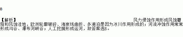 B 【解析】风力侵蚀作用形成风蚀蘑菇和风蚀洼地,欧洲轮廓破碎、海岸线曲折、多湖泊是因为冰川作用形成的;河流冲蚀作用常常形成沟谷、瀑布河峡谷;人工挖掘形成运河,故答案选B。