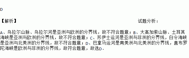 D ¡¾½âÎö¡¿ÊÔÌâ·ÖÎö£º A¡¢ÎÚÀ¶ûɽÂö¡¢ÎÚÀ¶ûºÓÊÇÑÇÖÞÓëÅ·Ö޵ķֽçÏߣ¬¹Ê²»·ûºÏÌâÒ⣻B¡¢´ó¸ß¼ÓË÷ɽÂö¡¢ÍÁ¶úÆäº£Ï¿ÊÇÑÇÖÞÓëÅ·Ö޵ķֽçÏߣ¬¹Ê²»·ûºÏÌâÒ⣻C¡¢ËÕÒÁÊ¿Ô˺ÓÊÇÑÇÖÞÓë·ÇÖ޵ķֽçÏߣ¬°×ÁϿÊÇÑÇÖÞÓë±±ÃÀÖ޵ķֽçÏߣ¬¹Ê²»·ûºÏÌâÒ⣻D¡¢°ÍÄÃÂíÔ˺ÓÊÇÄÏÃÀÖÞÓë±±ÃÀÖ޵ķֽçÏߣ¬Ö±²¼ÂÞÍÓº£Ï¿ÊÇÅ·ÖÞÓë·ÇÖ޵ķֽçÏߣ¬¹Ê·ûºÏÌâÒ⣬¹ÊÑ¡D£®