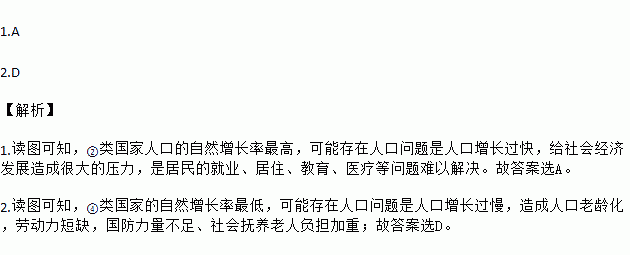 1.A 2.D 【解析】 1.读图可知,②类国家人口的自然增长率最高,可能存在人口问题是人口增长过快,给社会经济发展造成很大的压力,是居民的就业、居住、教育、医疗等问题难以解决。故答案选A。 2.读图可知,④类国家的自然增长率最低,可能存在人口问题是人口增长过慢,造成人口老龄化,劳动力短缺,国防力量不足、社会抚养老人负担加重;故答案选D。