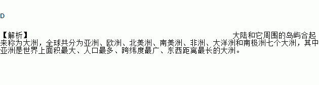 D 【解析】大陆和它周围的岛屿合起来称为大洲,全球共分为亚洲、欧洲、北美洲、南美洲、非洲、大洋洲和南极洲七个大洲,其中亚洲是世界上面积最大、人口最多、跨纬度最广、东西距离最长的大洲。
