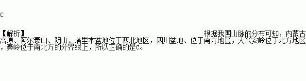A. 天山、秦岭、阴山、四川盆地 B. 阿尔泰山、准噶尔盆地、秦岭、大兴安林 C. 内蒙古高原、阿尔泰山、阴山、塔里木盆地 D. 天山、阿尔泰山、阴山、四川盆地
