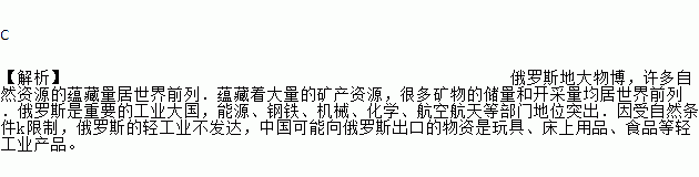 C 【解析】俄罗斯地大物博,许多自然资源的蕴藏量居世界前列.蕴藏着大量的矿产资源,很多矿物的储量和开采量均居世界前列.俄罗斯是重要的工业大国,能源、钢铁、机械、化学、航空航天等部门地位突出.因受自然条件k限制,俄罗斯的轻工业不发达,中国可能向俄罗斯出口的物资是玩具、床上用品、食品等轻工业产品。