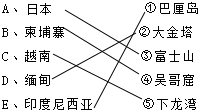 解答:解:日本最高峰富士山,富士山是该国的象征,吴哥窟是柬埔寨的著名旅游景点,下龙湾是越南著名的旅游景点,大金塔是缅甸的著名旅游景点,巴厘岛是印度尼西亚的旅游胜地.