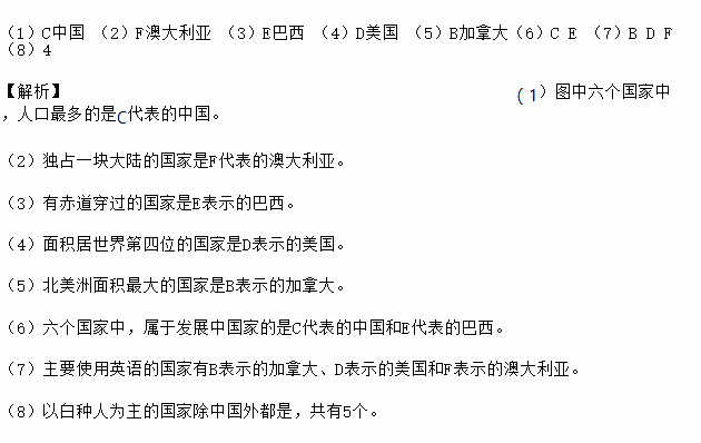 (1)C中国 (2)F澳大利亚 (3)E巴西 (4)D美国 (5)B加拿大(6)C E (7)B D F (8)4 【解析】(1)图中六个国家中,人口最多的是C代表的中国。 (2)独占一块大陆的国家是F代表的澳大利亚。 (3)有赤道穿过的国家是E表示的巴西。 (4)面积居世界第四位的国家是D表示的美国。 (5)北美洲面积最大的国家是B表示的加拿大。 (6)六个国...