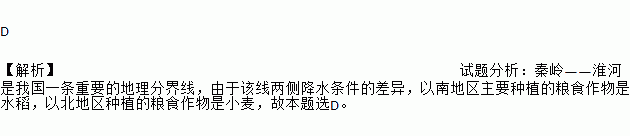 D 【解析】试题分析:秦岭——淮河是我国一条重要的地理分界线,由于该线两侧降水条件的差异,以南地区主要种植的粮食作物是水稻,以北地区种植的粮食作物是小麦,故本题选D。