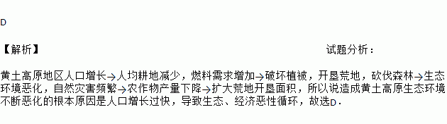 D ¡¾½âÎö¡¿ÊÔÌâ·ÖÎö£º »ÆÍÁ¸ßÔµØÇøÈË¿ÚÔö³¤¡úÈ˾ù¸ûµØ¼õÉÙ£¬È¼ÁÏÐèÇóÔö¼Ó¡úÆÆ»µÖ²±»£¬¿ª¿Ñ»ÄµØ£¬¿³·¥ÉÁÖ¡úÉú̬»·¾³¶ñ»¯£¬×ÔÈ»ÔÖº¦Æµ·±¡úÅ©×÷Îï²úÁ¿Ï½µ¡úÀ©´ó»ÄµØ¿ª¿ÑÃæ»ý£¬ËùÒÔ˵Ôì³É»ÆÍÁ¸ßÔÉú̬»·¾³²»¶Ï¶ñ»¯µÄ¸ù±¾ÔÒòÊÇÈË¿ÚÔö³¤¹ý¿ì£¬µ¼ÖÂÉú̬¡¢¾¼Ã¶ñÐÔÑ»·£¬¹ÊÑ¡D£®