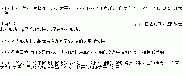 £¨1£©·ÇÖÞ ÃÀÖÞ Äϼ«ÖÞ £¨2£©Ì«Æ½Ñó £¨3£©ÑÇÅ·£¨Ó¡¶ÈÑó£© Ó¡¶ÈÑó£¨ÑÇÅ·£© £¨4£©»îÔ¾ »·Ì«Æ½Ñó ¡¾½âÎö¡¿£¨1£©ÓÉͼ¿ÉÖª£¬Í¼ÖÐBÊÇ·ÇÖÞ°å¿é£¬EÊÇÃÀÖÞ°å¿é£¬FÊÇÄϼ«ÖÞ°å¿é¡£ £¨2£©Áù´ó°å¿éÖУ¬»ù±¾Îªº£ÑóµÄÊÇD±íʾµÄ̫ƽÑó°å¿é¡£ £¨3£©¢ÚϲÂíÀÑÅɽÂöÊÇÓÉA±íʾµÄÑÇÅ·°å¿éºÍC±íʾµÄÓ¡¶ÈÑó°å¿éÏ໥¼·Ñ¹ÅöײÐγɵġ£ £¨4£©Ò»°ãÀ´Ëµ£¬Î»ÓÚ°å¿éºÍ°å¿éµÄ½»½ç´¦£¬µØ¿Ç±È½Ï»îÔ¾£¬ËùÒÔ¾³£·¢Éú...