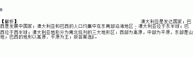 B 【解析】澳大利亚是发达国家;巴西是发展中国家;澳大利亚和巴西的人口均集中在东南部沿海地区;澳大利亚位于东半球;巴西位于西半球;澳大利亚地形分为南北纵列的三大地形区:西部为高原,中部为平原,东部是山地;巴西的地形以高原、平原为主;故答案选B。