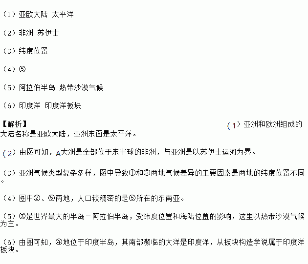 (1)亚欧大陆 太平洋 (2)非洲 苏伊士 (3)纬度位置 (4)⑤ (5)阿拉伯半岛 热带沙漠气候 (6)印度洋 印度洋板块 【解析】(1)亚洲和欧洲组成的大陆名称是亚欧大陆,亚洲东面是太平洋。 (2)由图可知,A大洲是全部位于东半球的非洲,与亚洲是以苏伊士运河为界。 (3)亚洲气候类型复杂多样,图中导致①和⑤两地气候差异的主要因素是两地的纬度位置...