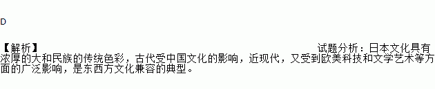 D 【解析】试题分析:日本文化具有浓厚的大和民族的传统色彩,古代受中国文化的影响,近现代,又受到欧美科技和文学艺术等方面的广泛影响,是东西方文化兼容的典型。
