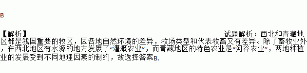 B 【解析】试题解析:西北和青藏地区都是我国重要的牧区,因各地自然环境的差异,牧场类型和代表牧畜又有差异。除了畜牧业外,在西北地区有水源的地方发展了“灌溉农业”,而青藏地区的特色农业是“河谷农业”,两地种植业的发展受到不同地理因素的制约,故选择答案B.