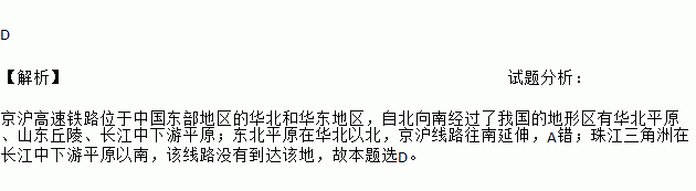 D 【解析】试题分析: 京沪高速铁路位于中国东部地区的华北和华东地区,自北向南经过了我国的地形区有华北平原、山东丘陵、长江中下游平原;东北平原在华北以北,京沪线路往南延伸,A错;珠江三角洲在长江中下游平原以南,该线路没有到达该地,故本题选D。