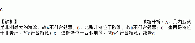 C 【解析】试题分析:A.几内亚湾是非洲最大的海湾,故A不符合题意;B.比斯开湾位于欧洲,故B不符合题意;C.墨西哥湾位于北美洲,故C符合题意;D.波斯湾位于西亚地区,故D不符合题意,故选C.