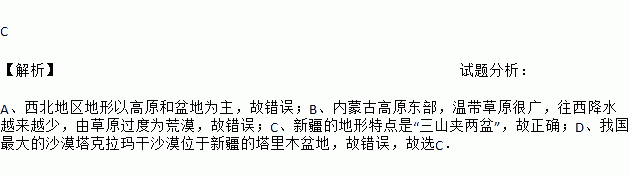 C 【解析】试题分析: A、西北地区地形以高原和盆地为主,故错误;B、内蒙古高原东部,温带草原很广,往西降水越来越少,由草原过度为荒漠,故错误;C、新疆的地形特点是“三山夹两盆”,故正确;D、我国最大的沙漠塔克拉玛干沙漠位于新疆的塔里木盆地,故错误,故选C.