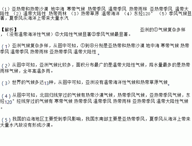 (1)亚热带和热带沙漠 地中海 寒带气候 热带季风 温带季风 热带雨林 亚热带季风 温带大陆性 (2)温带大陆性 热带雨林 (3)热带草原 温带海洋 (4)东经120° (5)季风气候显著,夏季风从海洋上带来大量水汽 【解析】亚洲的①气候复杂多样,(没有温带海洋性气候)②大陆性气候显著③季风气候最显著。 (1)亚洲气候复杂多样,从图中可知,①到⑧分别是亚热带和热带沙漠 地中海 寒带气候...