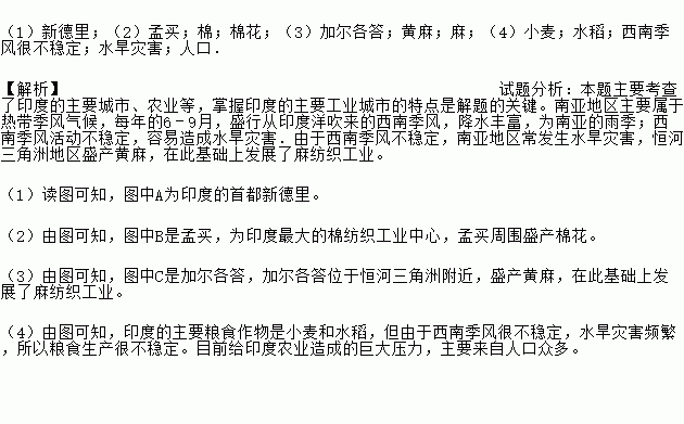 (1)新德里;(2)孟买;棉;棉花;(3)加尔各答;黄麻;麻;(4)小麦;水稻;西南季风很不稳定;水旱灾害;人口. 【解析】试题分析:本题主要考查了印度的主要城市、农业等,掌握印度的主要工业城市的特点是解题的关键。南亚地区主要属于热带季风气候,每年的6﹣9月,盛行从印度洋吹来的西南季风,降水丰富,为南亚的雨季;西南季风活动不稳定,容易造成水旱灾害.由于西南季风不稳定,南亚地区常发生水旱灾害,...