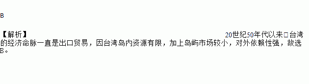 B 【解析】20世纪50年代以来,台湾的经济命脉一直是出口贸易,因台湾岛内资源有限,加上岛屿市场较小,对外依赖性强,故选B。