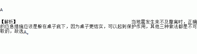 A 【解析】当地震发生来不及撒离时,正确的应急措施应该是躲在桌子底下,因为桌子更结实,可以起到保护作用,其他三种做法都是不可取的,故选A。