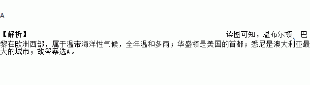 A 【解析】读图可知,温布尔顿、巴黎在欧洲西部,属于温带海洋性气候,全年温和多雨;华盛顿是美国的首都;悉尼是澳大利亚最大的城市;故答案选A。