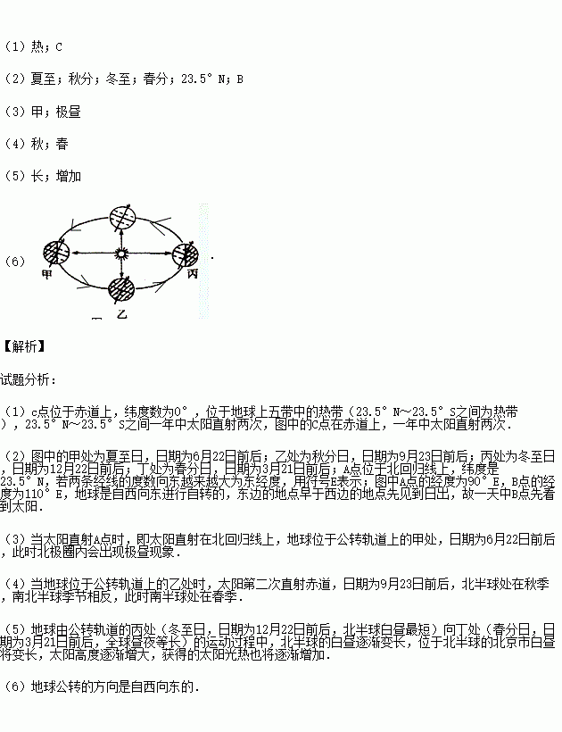 (5)µØÇòÓɹ«×ª¹ìµÀµÄ±û´¦Ïò¶¡´¦Ô˶¯¹ý³ÌÖУ¬±±¾©Êеİ×Ö罫±ä__________ (Ìî¡°³¤¡±»ò¡°¶Ì¡±)£¬»ñµÃµÄÌ«Ñô¹âÈÈÒ²½«Öð½¥__________ (Ìî¡°Ôö¼Ó¡±»ò¡°¼õÉÙ¡±)¡£